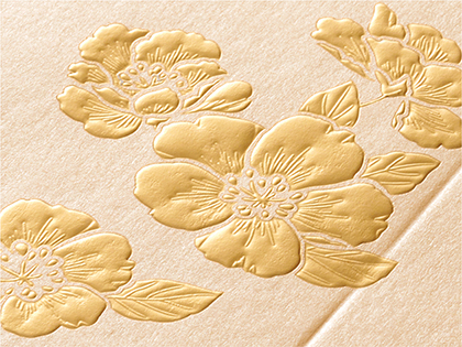 絹のようにしっとりと輝くパール紙に、彫刻版による立体的で繊細な金箔押しを施した豪華な仕上がりです。