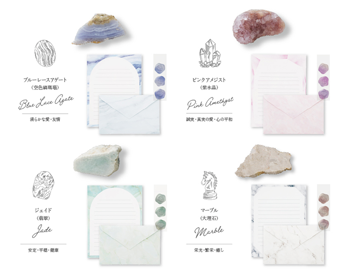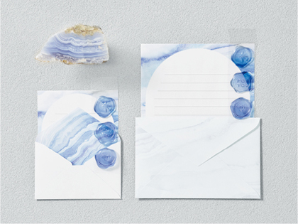 透明で立体的なシーリングワックス風シール付きの、鉱石をイメージしたレターセットです。
