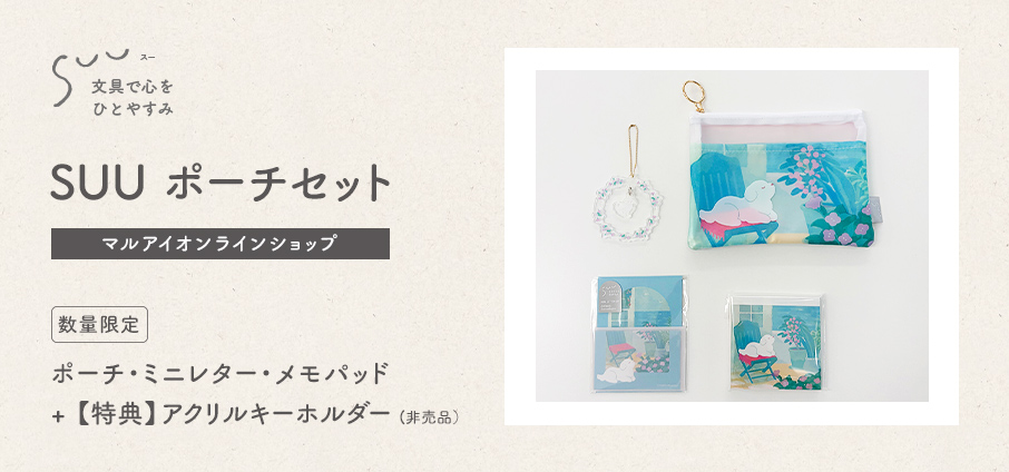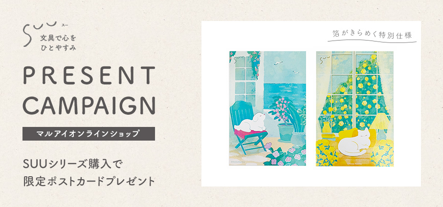 ただいまマルアイオンラインショップにて『SUU(スー)シリーズ』をご購入いただいたお客様に、先着で限定オリジナルポストカード(非売品)を1枚プレゼントいたします。